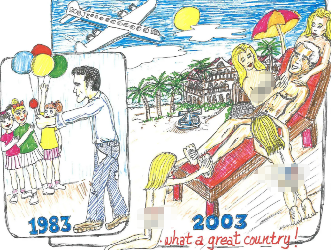 图片的右边,爱泼斯坦在一群几乎全裸的女性为他按摩时面带微笑。天上还有他把少女和贵宾们运到“恶魔岛”的私人班机。