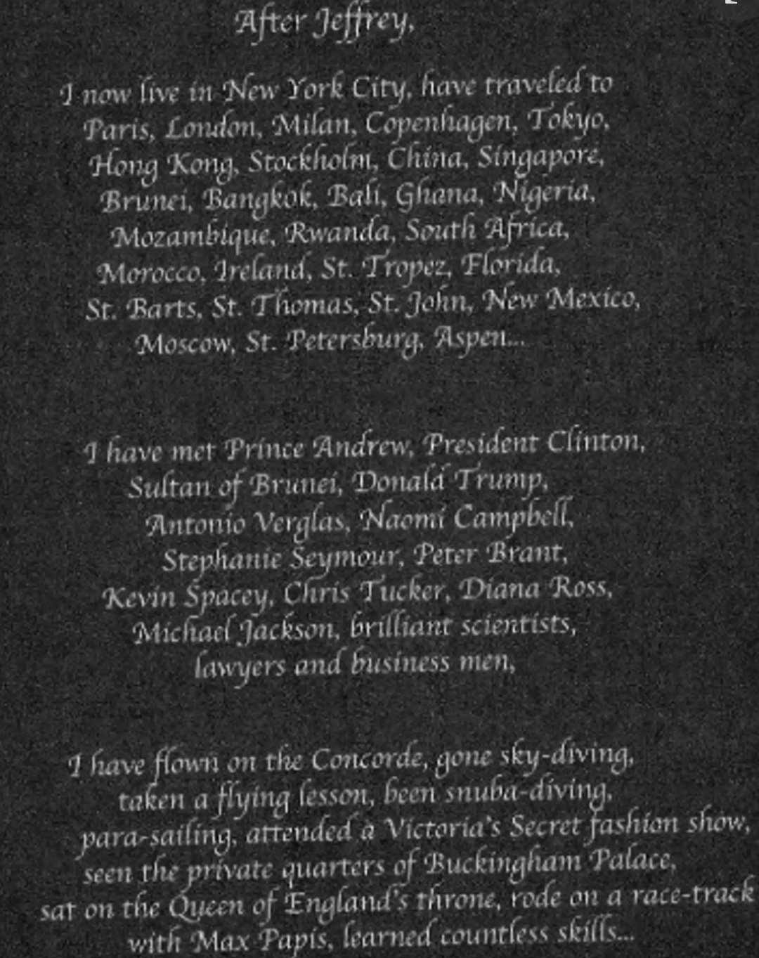 但有一位身份不明的女性助理在日记中写道,多亏了爱泼斯坦,她才得以结识安德鲁王子、比尔·克林顿和川普。同样是托他的福,她参观过白金汉宫的私人住所,坐过英国女王的宝座。
