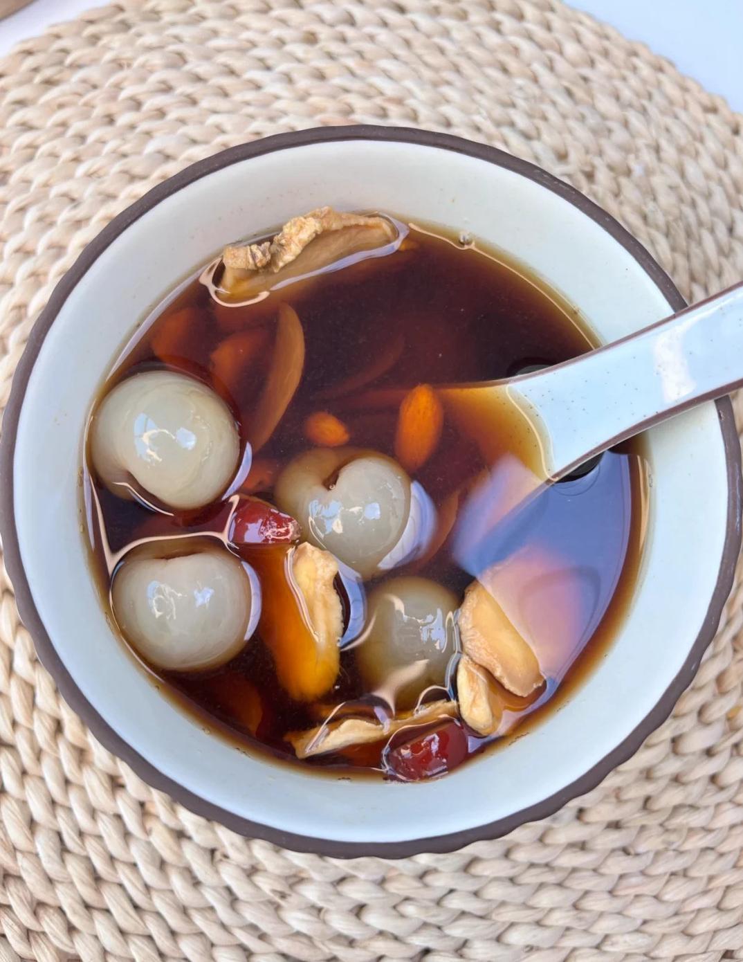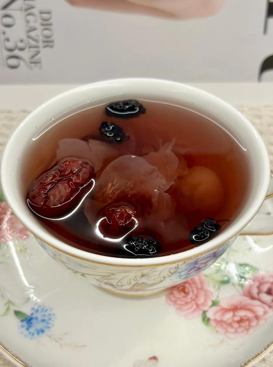 现在我煮得可溜了:5 颗带壳桂圆(挑的时候捏着有弹性、闻着有甜香的才好)敲裂,加 3 颗桑葚干、1 块泡软的茯苓,冷水下锅小火煮 20 分钟,煮到汤能挂在勺子上就差不多了,最后撒把玫瑰焖 3 分钟。