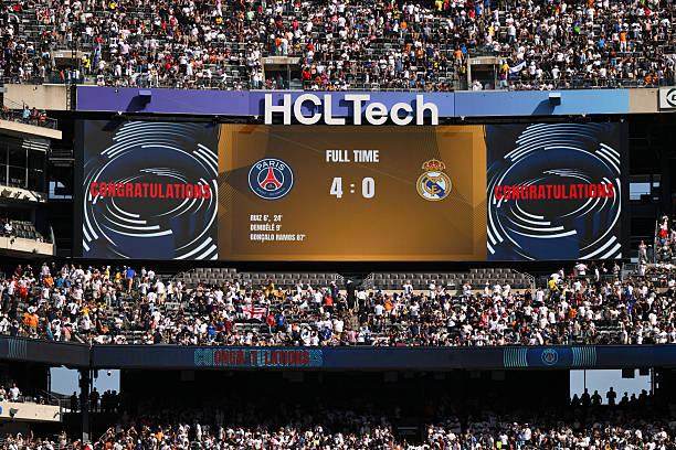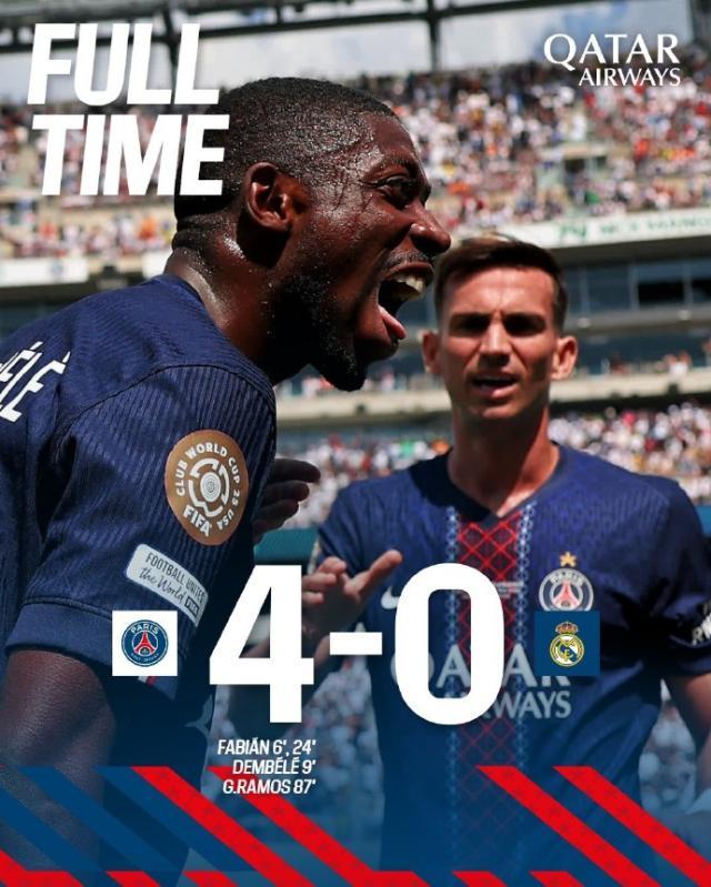 世俱杯半决赛,皇马在新泽西MetLife体育场对阵巴黎圣日耳曼。结果在这种欧洲新旧王者之战中,皇马0-4惨败,结束世俱杯之旅;巴黎则延续了恐怖的统治力,在世俱杯淘汰赛连续淘汰拜仁和皇马,决赛将对阵切尔西。